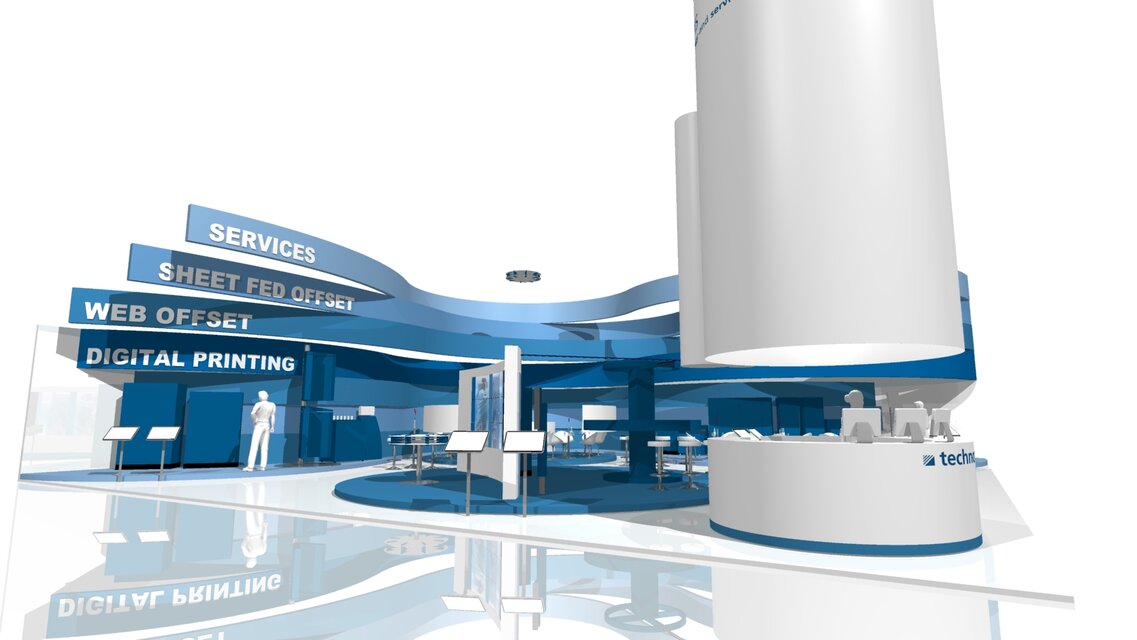 Η παραπάνω εικόνα με ρο εκθεσιακό περίπτερο είναι ένα στιγμιότυπο από μία παρουσίαση πραγματικού χρόνου. Εσείς ή/και ο πελάτης σας μπορείτε να περπατήσετε διαδραστικά μέσα σε μια τέτοια σκηνή ενεργοποιώντας ακόμη και εφέ φωτισμού, προβολές βίντεο και κινούμενων εικόνων σε πραγματικό χρόνο.
